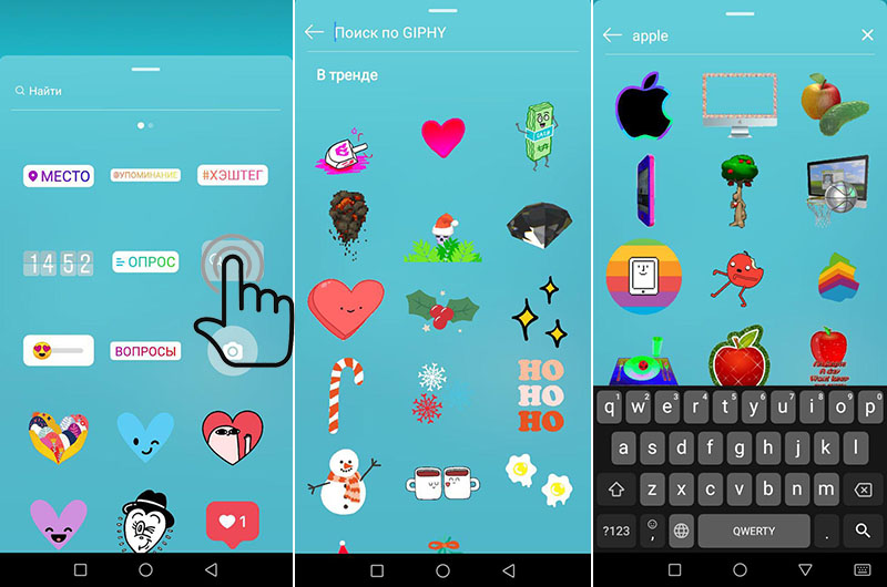 А чтобы добавить гифку – достаточно выбрать соответствующую функцию и с помощью ключевых слов (на английском) найти то, что вам необходимо.