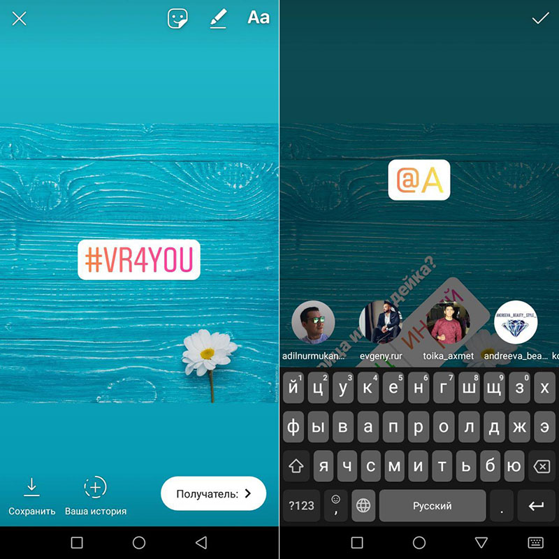 Помимо этого, можно отметить пользователя - актуально в тех случаях, когда вы проводите какие-то конкурсы и хотите показать победителя аудитории. Инстаграм позволяет публиковать хештеги в Сторис, его можно добавить, как с помощью специальной функции, показанной на скриншоте ниже, так и просто начав писать текст со значка «@».