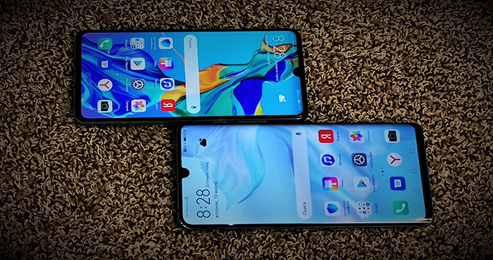 Huawei P30 оснащен OLED-дисплеем с диагональю 6,1 дюйм, а у P30 Pro диагональ больше на 0,46 дюйма, а вместо тотальной плоскости, появляется два горизонтальных углубления. Оба телефона имеют встроенный сканер отпечатков и процессор Huawei Kirin 980. Стандартный P30 имеет 6 ГБ ОЗУ и 128 ГБ расширяемой памяти, в то время как P30 Pro имеет 8 ГБ ОЗУ и модели с 128 ГБ, 256 ГБ и 512 ГБ памяти.