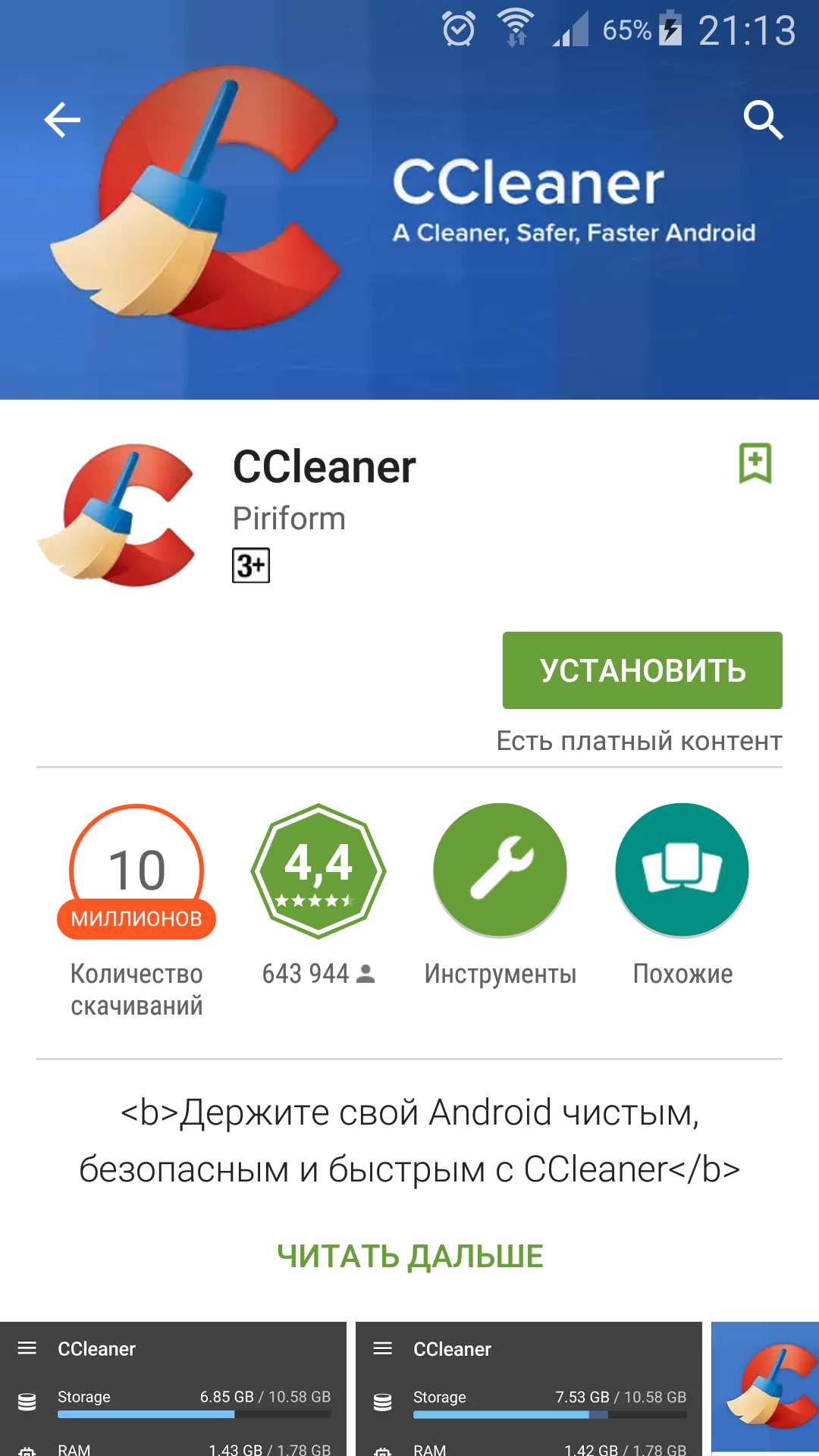 В Play Market много приложений, которые позволяют быстро очистить кэшированные данные. Обычно, в такие утилиты входит комплекс функций по оптимизации Android. Для примера рассмотрим известную утилиту CCleaner, от Piriform: