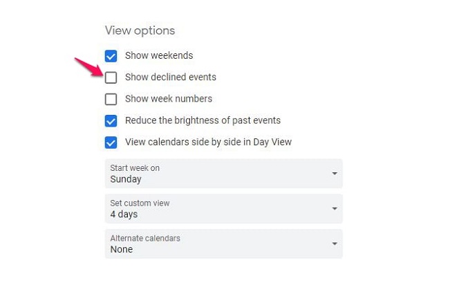 - Теперь прокрутите страницу вниз до раздела "Параметры просмотра" и снимите флажок "Показать отклоненные события". Это предотвратит показ отклоненного спама в Календаре Google.