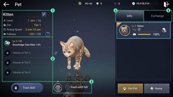 Питомцы чрезвычайно полезны, так как они собирают предметы и обеспечивают полезные баффы для авантюристов. Вы можете получить питомцев, выполняя квесты или покупая их в магазине за жемчуг. Питомцы получают случайные навыки во время покупки. Не забывайте кормить своих питомцев! Когда их датчик голода опустится до 0, они не смогут собирать предметы.