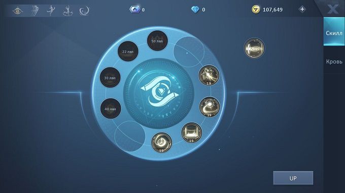 Лазурная печать – В области цели радиусом 5 метров применяется Матрица чистого золота, каждую секунду максимум 5 случайным врагам в Матрице наносится значительный урон, длится 8 сек. Время перезарядки 20 сек. Перемещая кнопку навыка, можно выбрать направление применения.