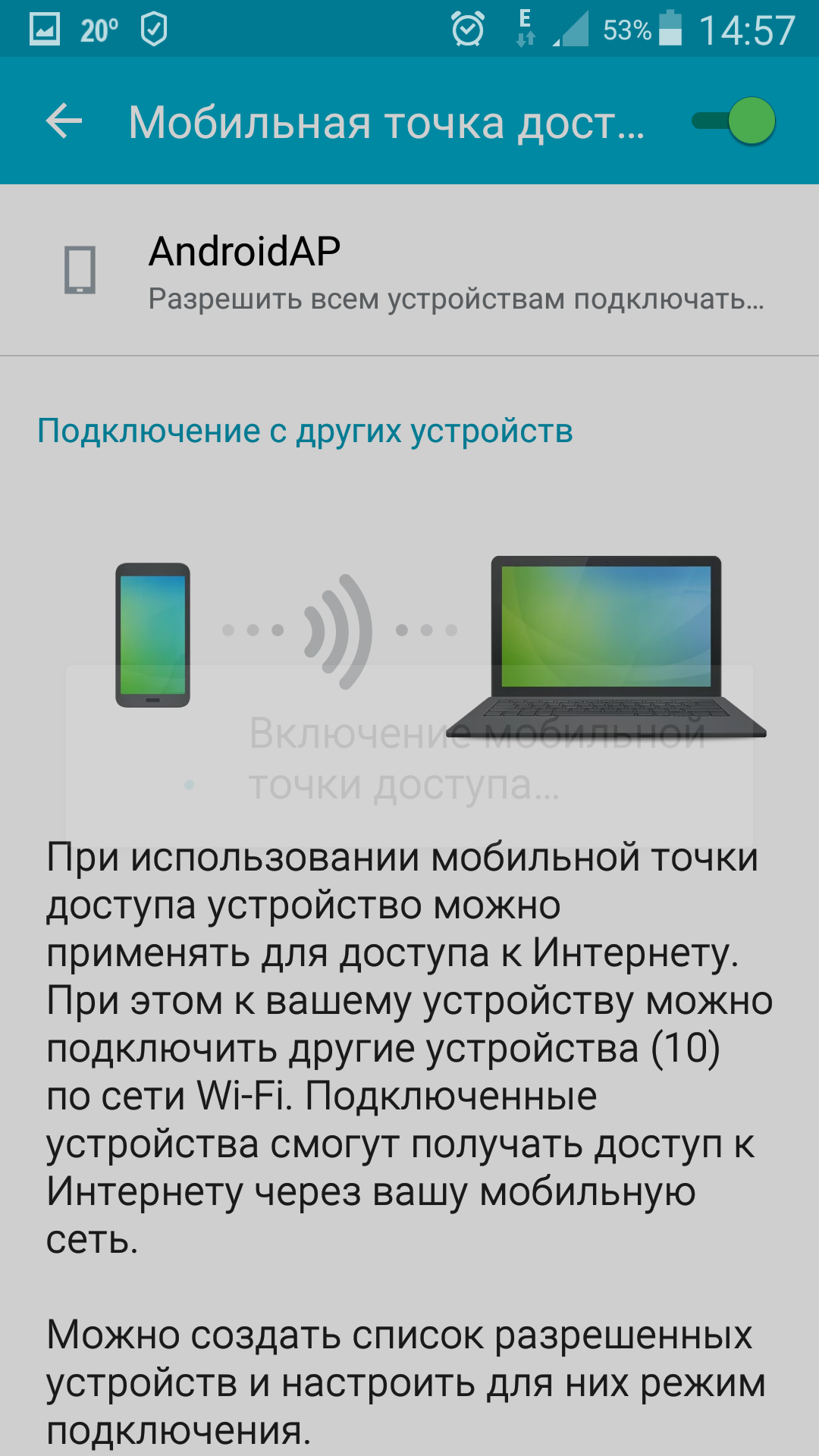 - Нажмите на AndroidAP чтобы выбрать, кому разрешить использовать Wi-Fi - "Все устройства" или "Только разрешенные устройства".