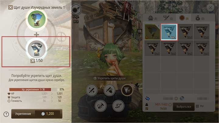 ① После выбора основного щита души автоматически отображается перечень щитов души из инвентаря, которые можно использовать в качестве материалов.