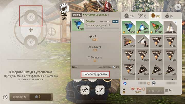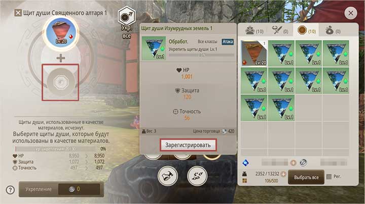 ② Чтобы зарегистрировать материалы, нажмите на подходящие щиты души из инвентаря.