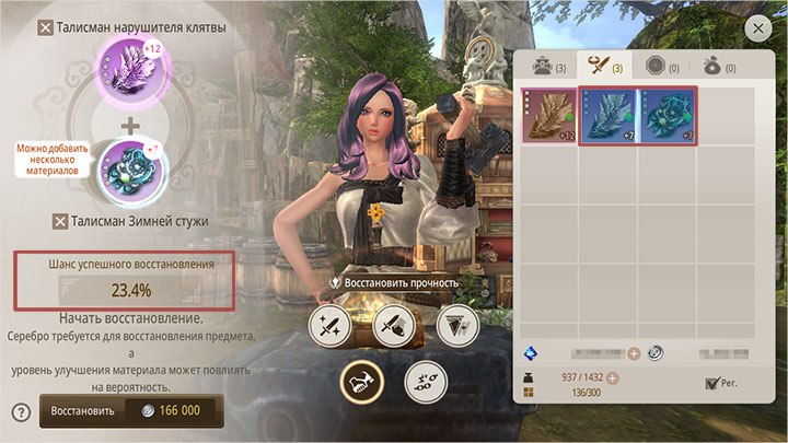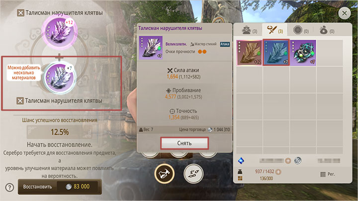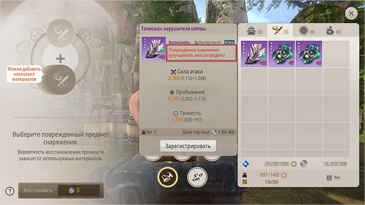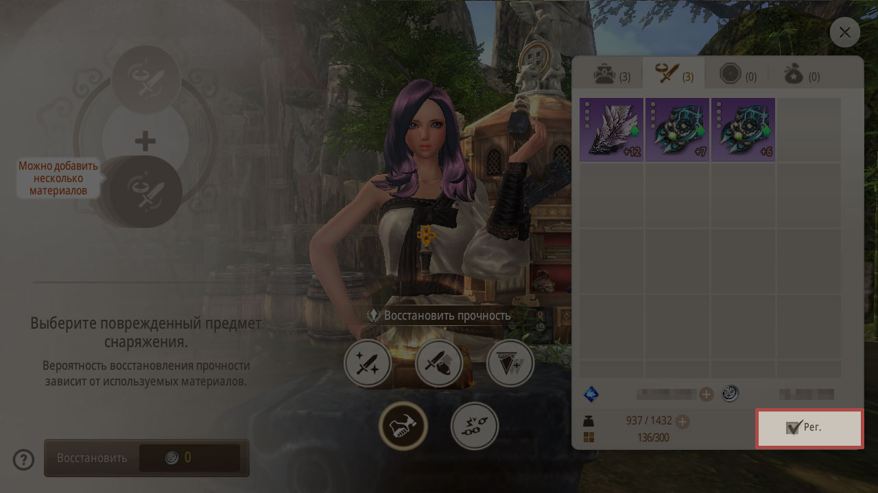 ② Зарегистрируйте снаряжение, которое будете использовать в качестве материала для восстановления прочности.