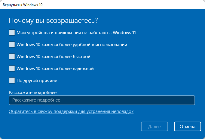 Процедура отката идентична откату Windows 10 на Windows 7 или 8. Отличие разве что в том, что мелкомягкие попросят предоставить дополнительную информацию о том, почему вы решили откатиться на десятку. Этот опрос необходим, чтобы улучшить Windows 11 в дальнейшем.