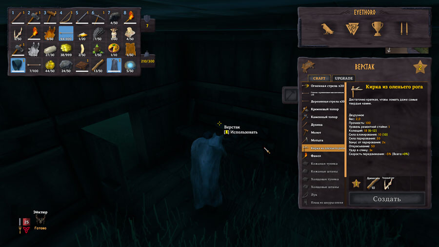 Первая, доступная для создания кирка в игре — кирка из оленьего рога. Для создания необходимо иметь в инвентаре 1 твёрдый рог и 10 древесины. Чтобы добыть твёрдый рог, придётся сразиться с первым боссом игры, оленем Эйктюром. Таким образом, Valheim не даёт открыть все возможности без продвижения по сюжетной линии.
