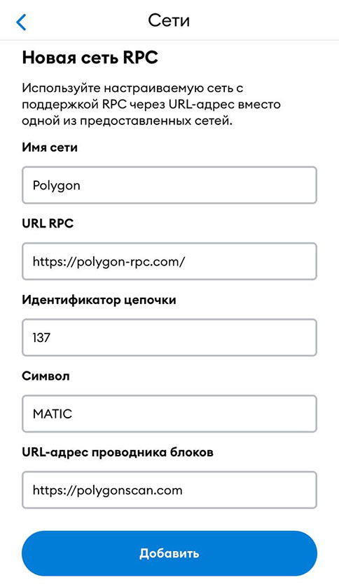 - Теперь вам нужно подключить сеть Polygon, для этого в настройках приложения выберите "Сети", нажмите "Добавить сеть" и введите данные как на скриншоте, после этого в настройках можно будет переключиться на сеть Polygon.