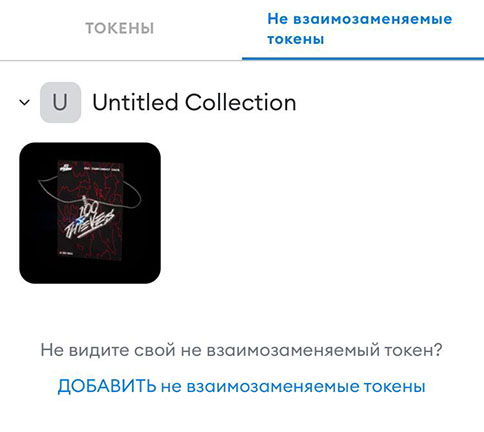 - Перейдите на главном экране приложения во вкладку Невзаимозаменяемые токены и нажмите "Добавить невзаимозаменяемые токены".