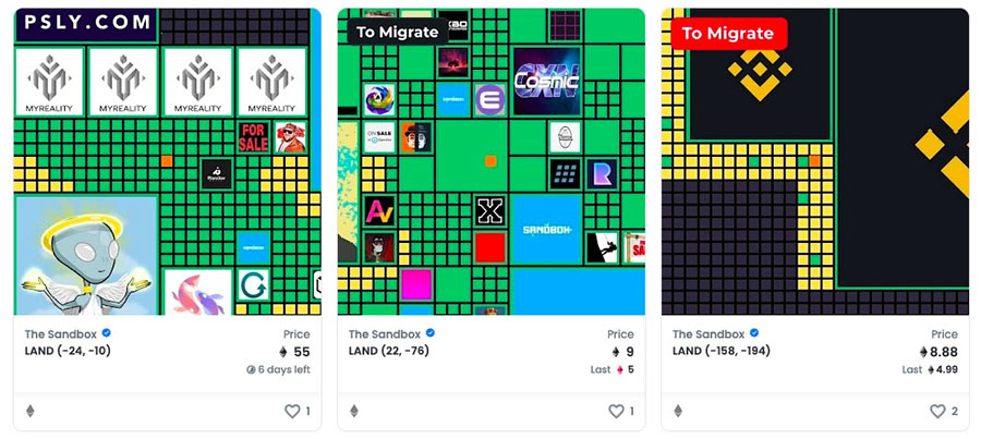 LAND ограничен "тиражом" в 166 464 единиц, по меркам цифрового мира — это совсем немного, поэтому на OpenSea уже сейчас можно увидеть весьма нескромные цены на некоторые земельные участки. Каждый токен LAND уникален, у него есть свои координаты в игровом мире. Можно купить как пустую землю и построить на ней что-то, так и готовое строение.