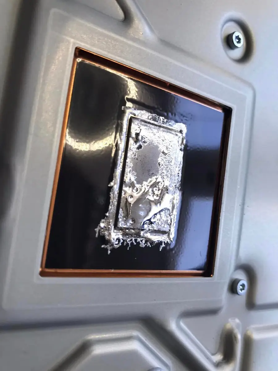 На картинке вы видите жидкий металл, используемый в системе охлаждения, который может в буквальном смысле вытечь на другие компоненты консоли при вертикальном размещении. Неизвестно, насколько это частая проблема, так как жидкий металл размещается между плотно прижатыми процессором и радиатором системы охлаждения, однако риск вероятно присутствует. При горизонтальном положении, даже при сильном нагреве устройства, жидкий металл останется на месте и не повредит приставку.