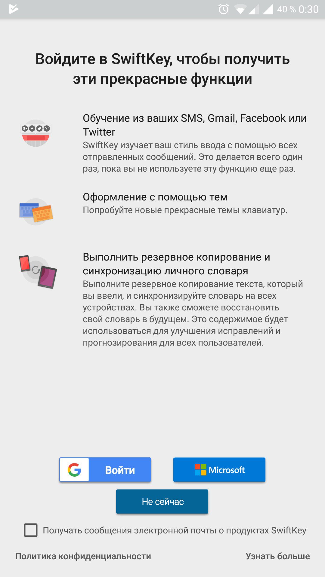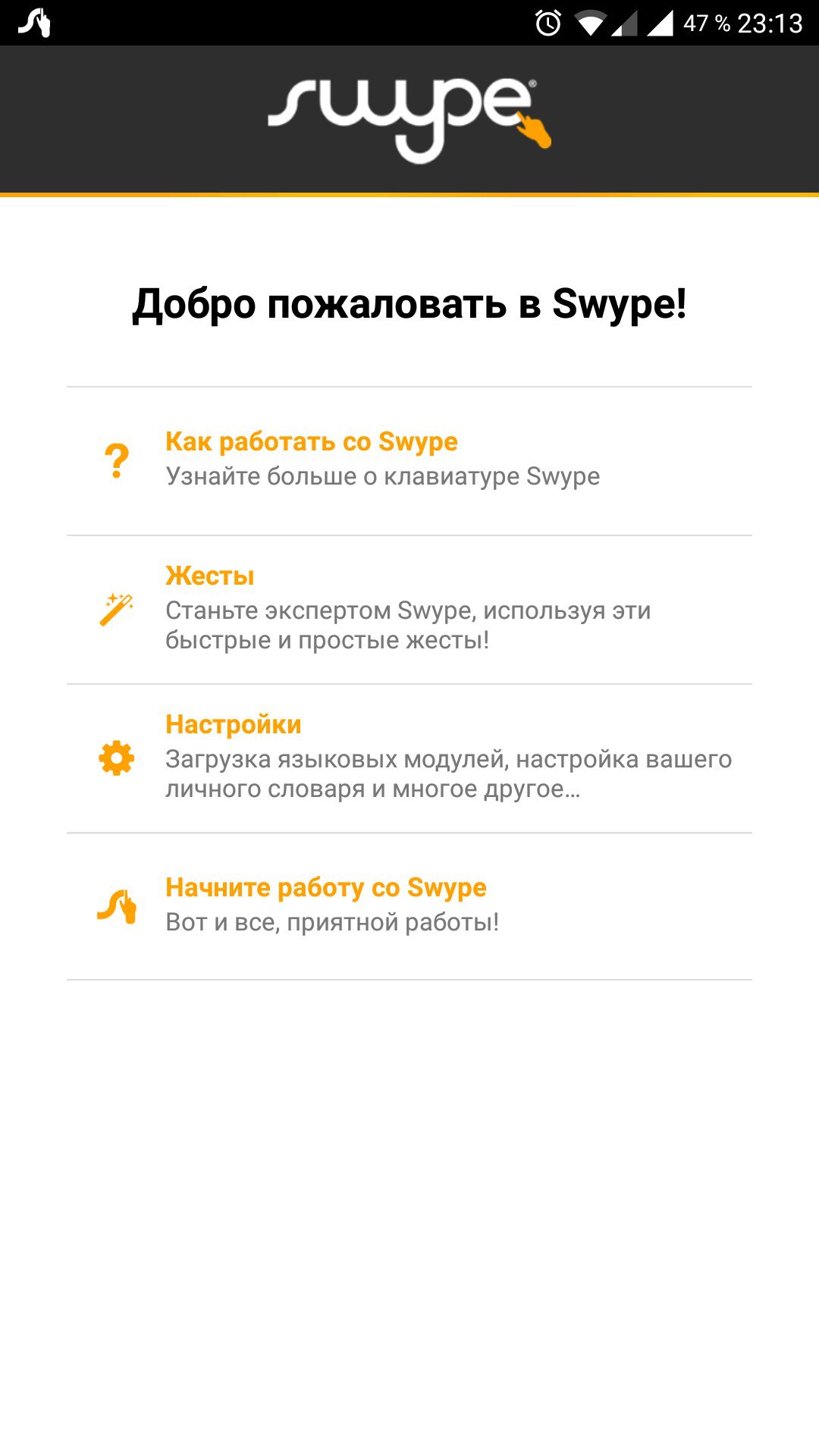 Следующий разработчик предлагает своему пользователю заострить внимание на том, что свайпами можно не только набирать текст, но и ставить пробел, уменьшать или увеличивать саму клавиатуру, удалять слова и т.д. А сами слова все-таки набирать как раньше – по букве.