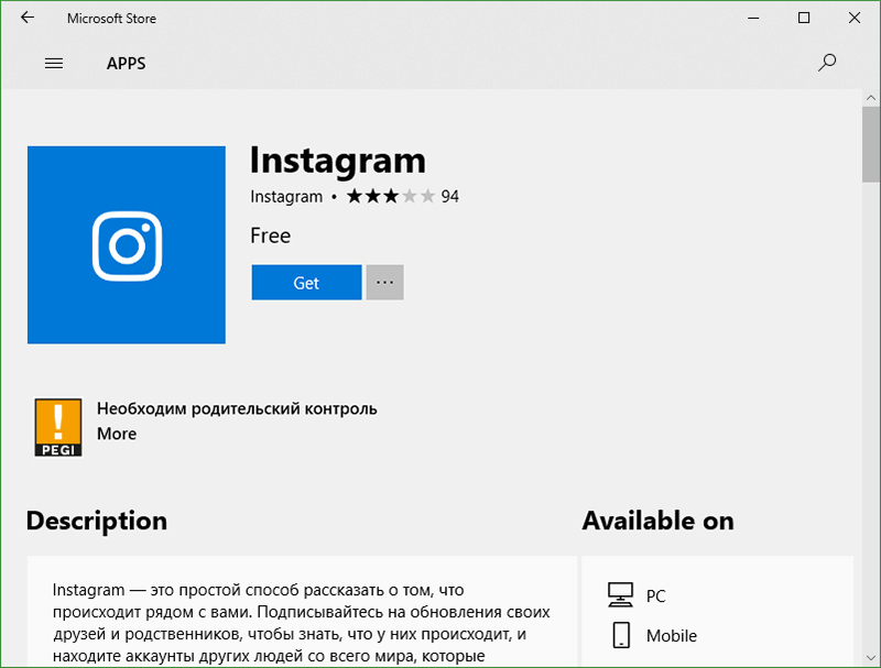 Официальное приложение Инстаграм для этой операционной системы можно найти бесплатно в магазине Windows 10. Раннее с помощью данной ОС можно было публиковать фотографии, находящиеся только на планшете. На компьютере и ноутбуке возможность ранее была ограничена.